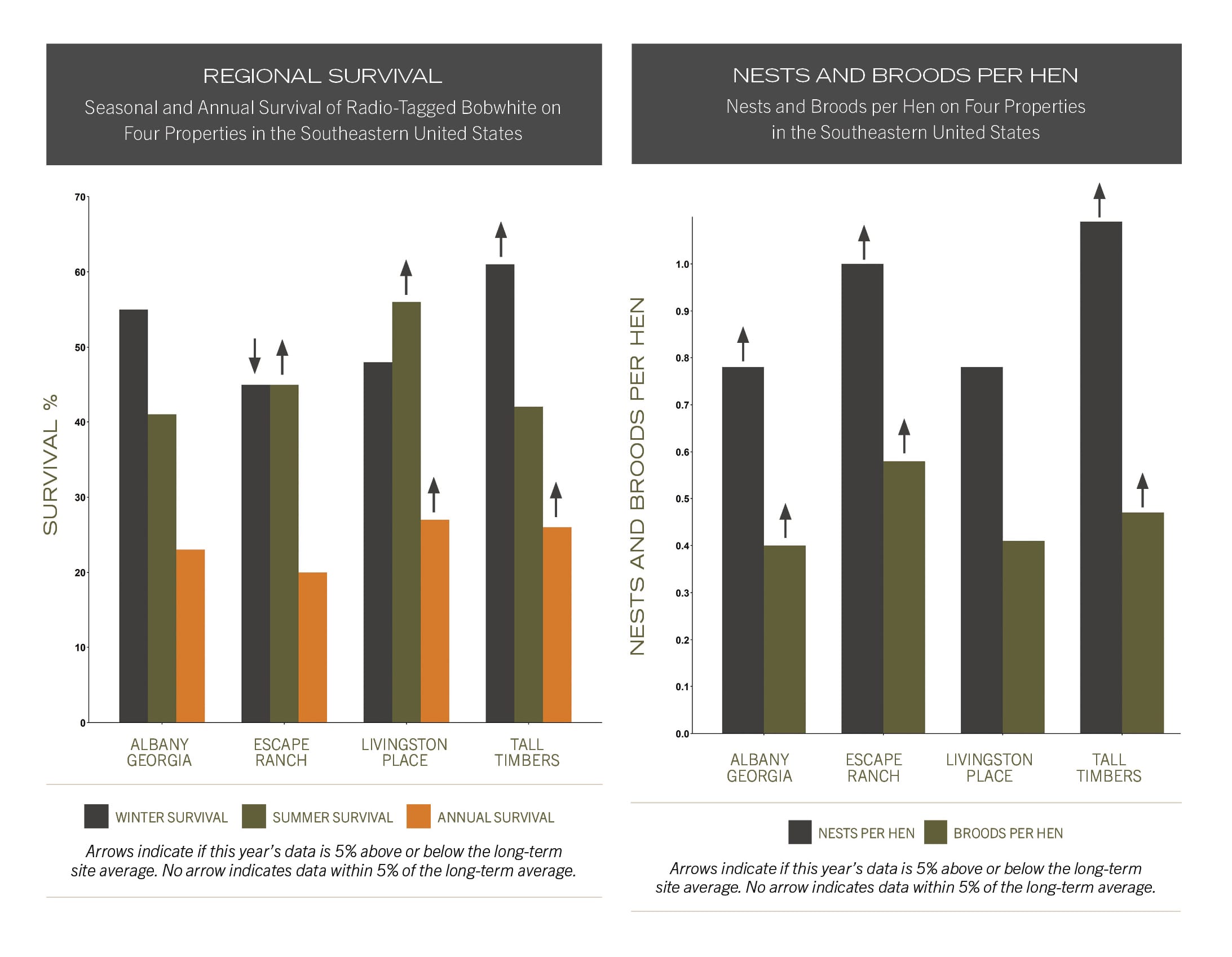On the eastern edge of the Red Hills, Livingston Place entered the breeding season with below average spring density. We attribute this to below average overwinter survival and lower reproduction in 2024. Similarly, Tall Timbers started the breeding season with a lower spring population that was primarily due to reduced reproduction in 2024 as overwinter survival was above average. Breeding bobwhite responded with early nest production and that effort continued throughout the season. Specifically, both nest and brood production was up at Livingston Place and similar to the site’s long-term averages. At Tall Timbers, we documented the highest nest production in the last fifteen years and above average brood production. The outstanding reproduction was partly due to cooperative weather resulting in ample cover. These excellent habitat conditions also contributed to average adult survival at Tall Timbers and above average adult survival at Livingston Place and good apparent chick survival at both sites. Due to the increased production and average survival across the Red Hills, we expect higher bobwhite numbers than last year.