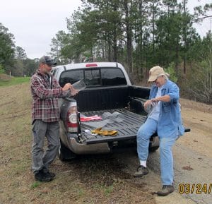 Collaborators Eric Soehren (Alabama Department of Conservation and Natural Resources) and Sharon Hermann (Auburn University, retired) make Schwalbea protection “cages” at the Alabama outplant site.
