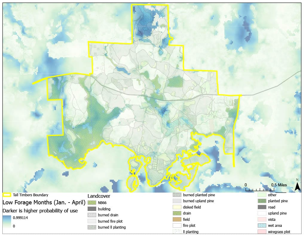 A map of Tall Timbers shows areas where pigs preferred during the winter months when forage was low.