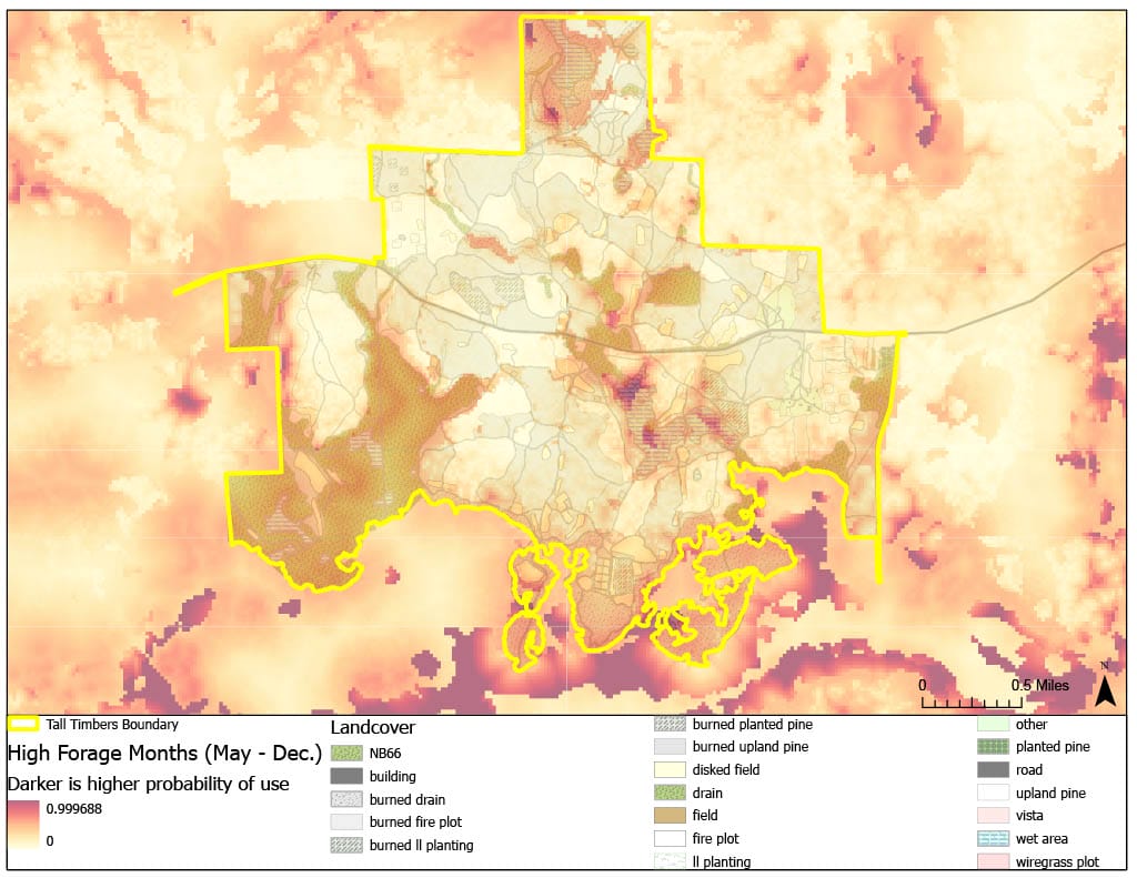 A map of Tall Timbers shows habitat where feral hogs spent time when forage opportunities were high.
