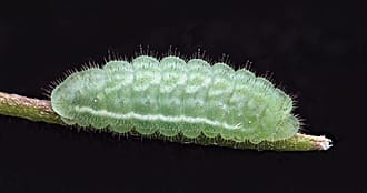 Two ¾” frosted elfin caterpillars under UV light at night: with fluorescent powder(left) and without (right).