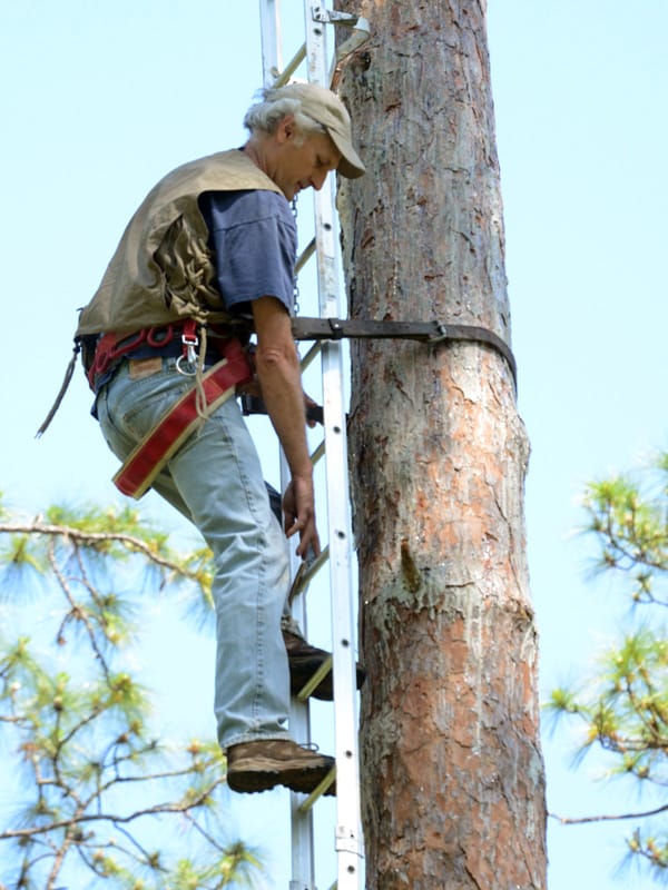 Jim Cox climbing ladder to Red-cockaded Woodpecker next cavity