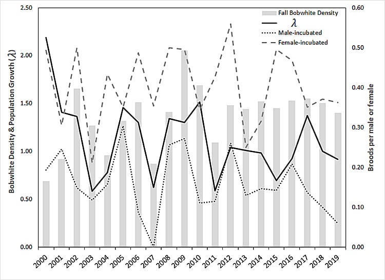 Figure 1. Bobwhite density (and lambda – population growth rate) and reproduction of Northern Bobwhite at Tall Timbers from 2000 – 2019. Gray bars represent bobwhite density (birds per acre) and solid black line lambda; the dotted-black line represents successful male-incubated nests per radio-tagged male (broods per male), and the dashed-grey line represents successful female-incubated nests per radio-tagged female (broods per female).
