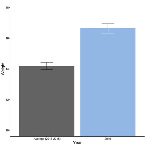 The permeating story line of the season so far is — above average chick growth and survival. Across four study sites this year, we have observed chicks weighing 2-3 grams more than previous years at the same age (see Figure 1). This is excellent news and has translated into exceptional chick survival. In fact, on a couple of our study sites we are observing the highest chick survival rates we have seen in the last five years. I suspect this is due the timing and amount of rainfall we’ve had this breeding season being more favorable to broods, compared to previous years, as well as good foraging conditions. That said, the abundant rainfall over the past week (mid-August), has taken a toll on brood size and chick survival for recently hatched chicks. However, chicks hatching in June and July, for the most part, have been unaffected by the rains of late.