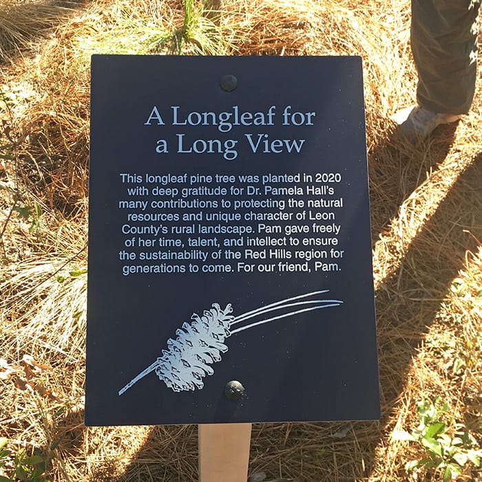 Several months ago, Tall Timbers staff planted a longleaf pine in Pam’s honor as a small token of our appreciation for her work helping to protect the Red Hills region of Leon County. Pam loved longleaf pines and their vital role in our natural community. The plaque accompanying the longleaf reads: “A Longleaf for a Long View: This longleaf pine tree was planted in 2020 with deep gratitude for Dr. Pamela Hall’s many contributions to protecting the natural resources and unique character of Leon County’s rural landscape. Pam gave freely of her time, talent, and intellect to ensure the sustainability of the Red Hills region for generations to come. For our friend, Pam.”