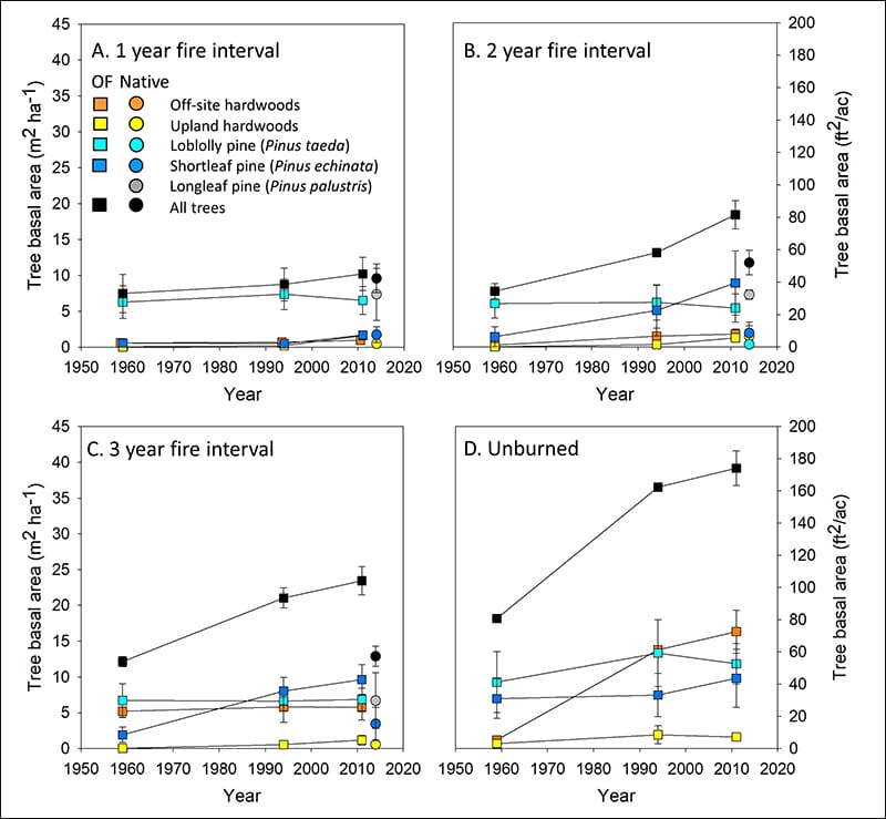Figure 1 shows our results, with square symbols representing the average basal area for each category of trees and error bars showing standard deviation among the three replicate plots per fire treatment. The round symbols show data from the Pebble Hill plots in native longleaf pine-wiregrass communities burned at the same intervals.
